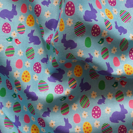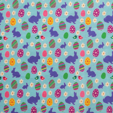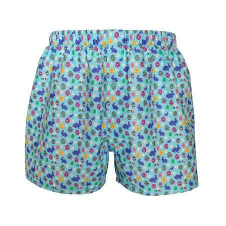 The boxer shorts feature small purple/blue bunnies on a light blue background with flowers, multi-coloured eggs and little birds.