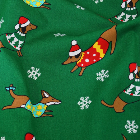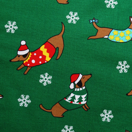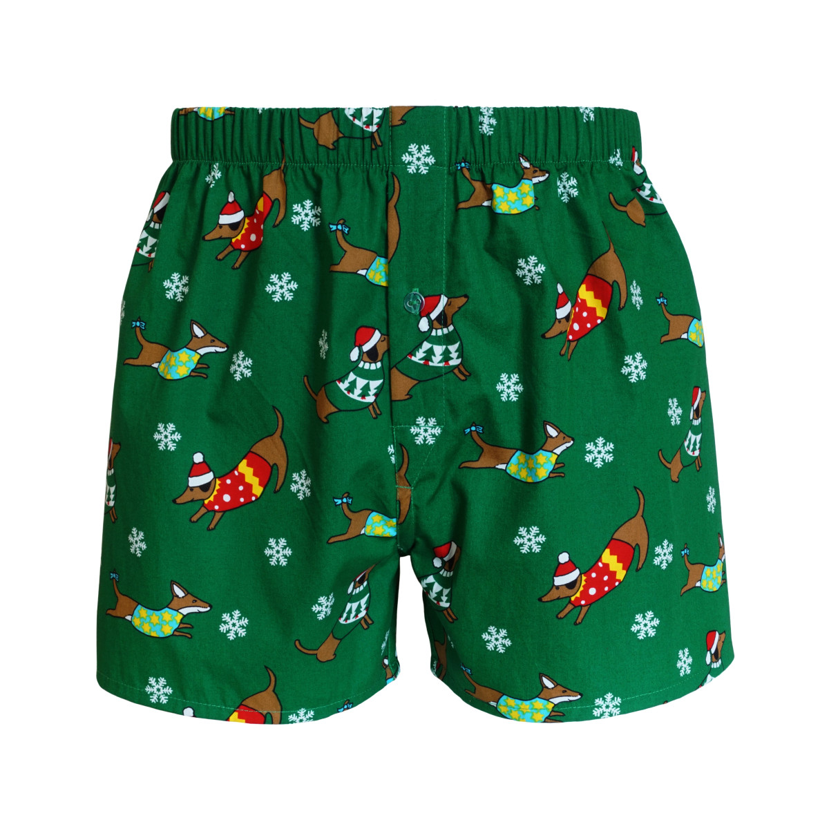 The boxer shorts feature festively-dressed dachshunds on a green background.