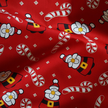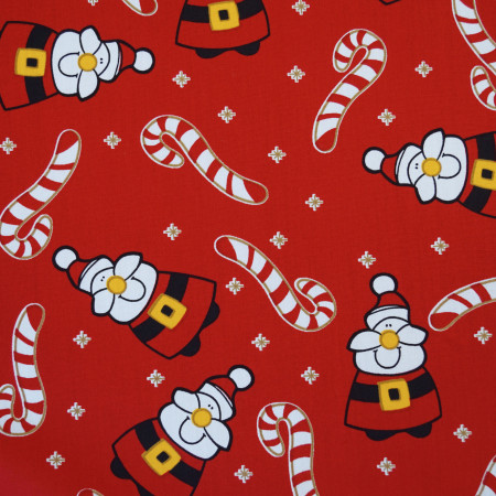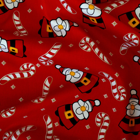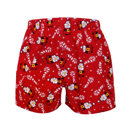 The boxer shorts feature numerous jolly Santas surrounded by large, striped, candy canes on a bright red background.