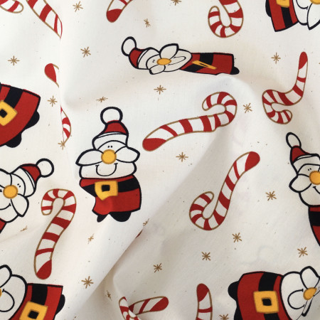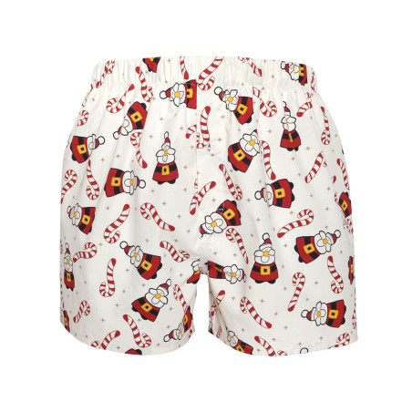 The boxer shorts feature numerous jolly Santas surrounded by large, striped, candy canes on a cream background.