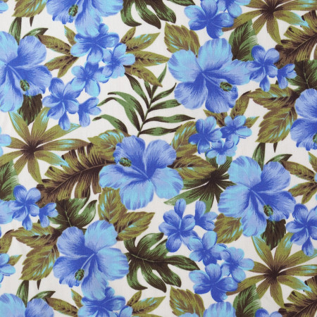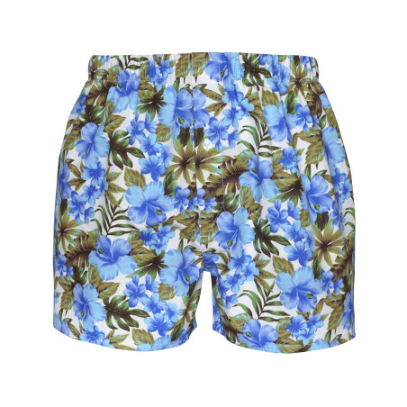 The boxer shorts feature blue hibiscus flowers on a white background.