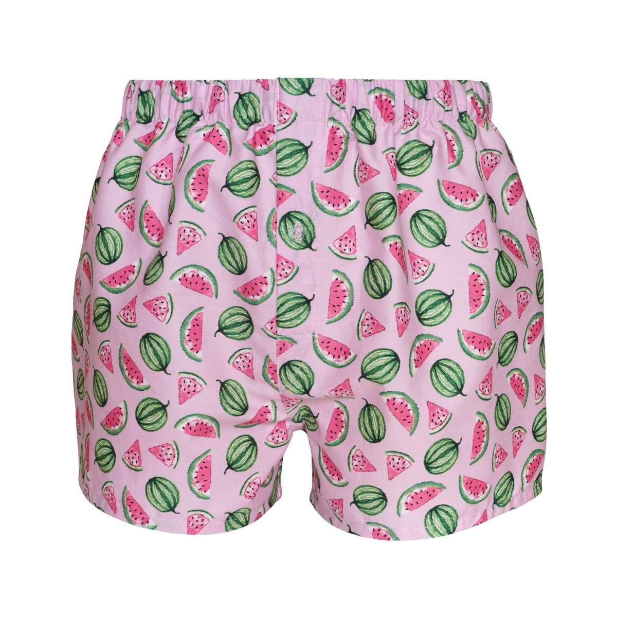 The boxer shorts feature big, juicy watermelons on a light pink background.