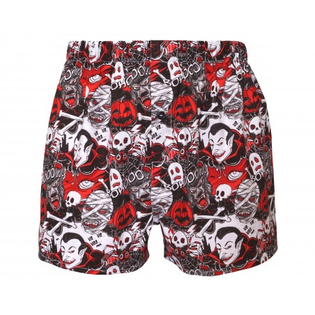 The boxer shorts feature a vampire with mummies, werewolves and spiders on a black background.