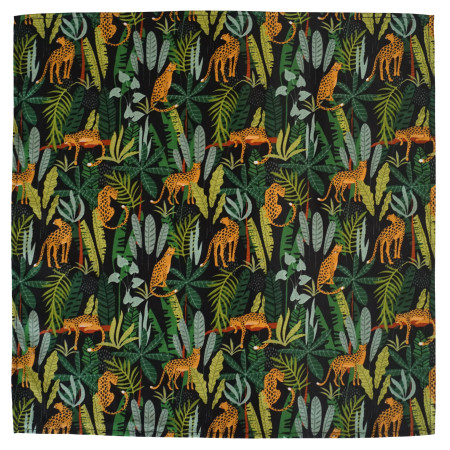 The hanky is adorned jungle leopards on a black background.
