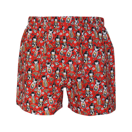 The boxer shorts feature a number of Japanese Kokeshi dolls wearing traditional dress on a red background.