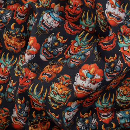 The printed cotton boxer shorts feature numerous strikingly colourful tribal masks on a very dark grey background.