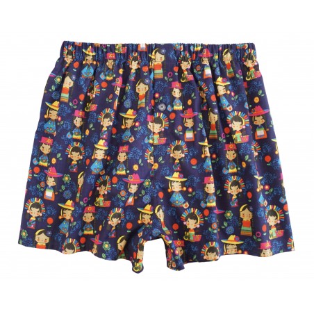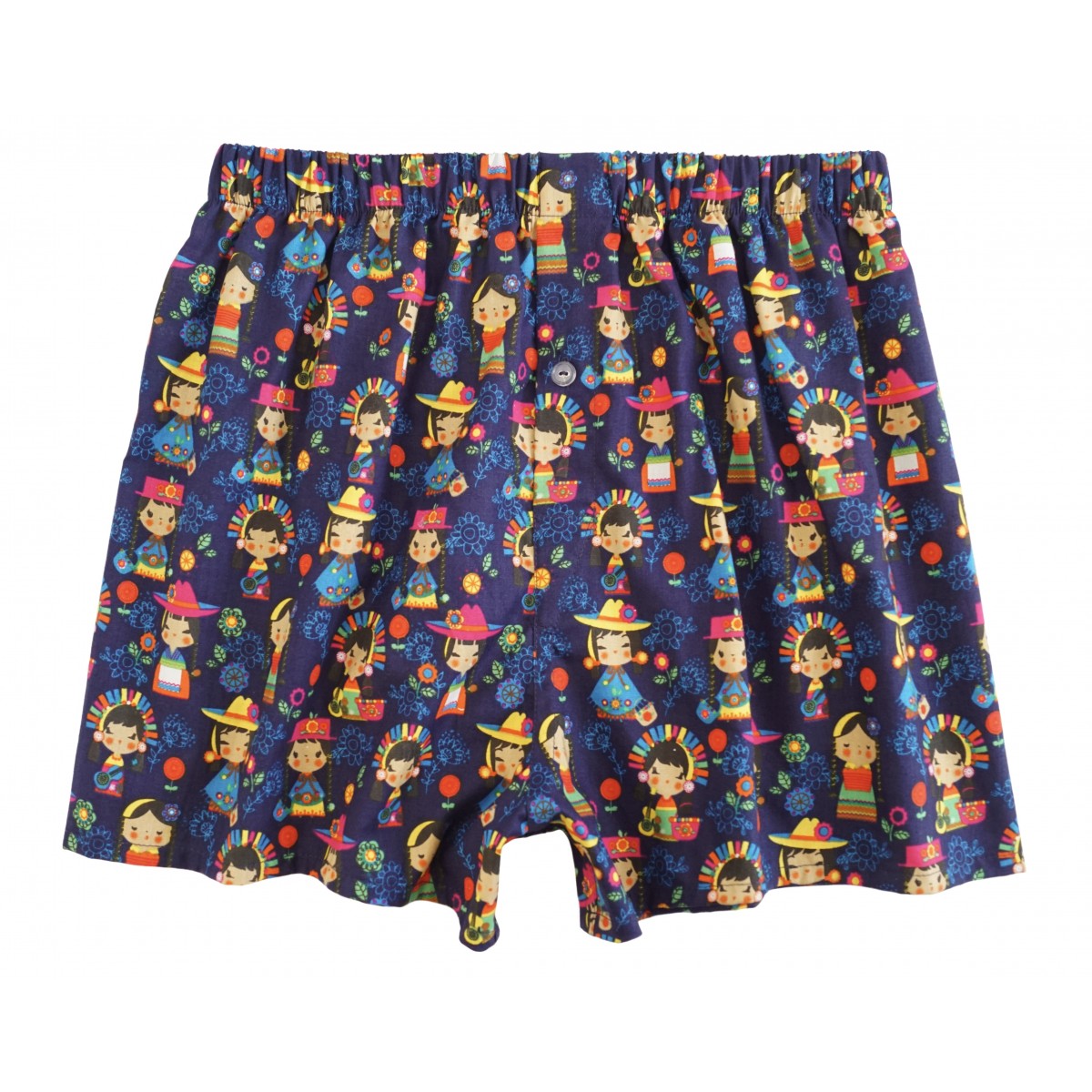 The boxer shorts feature a number of South American girls wearing traditional dress on a dark blue background.