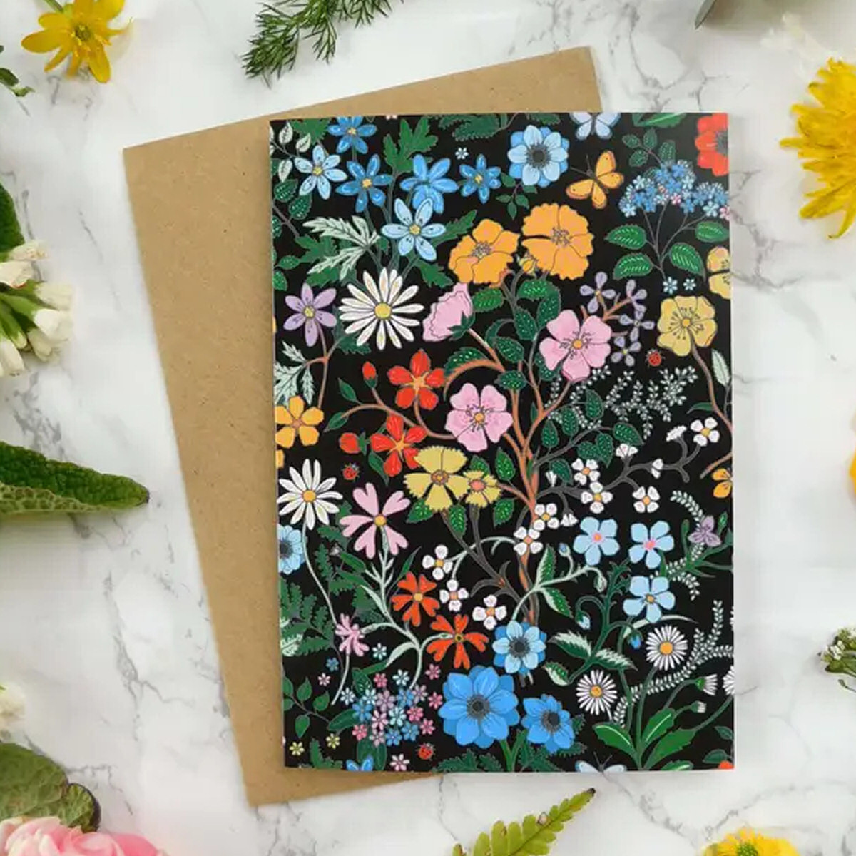 This colourful greetings card is packed with gorgeous wildflowers, inspired by the artist's own garden.